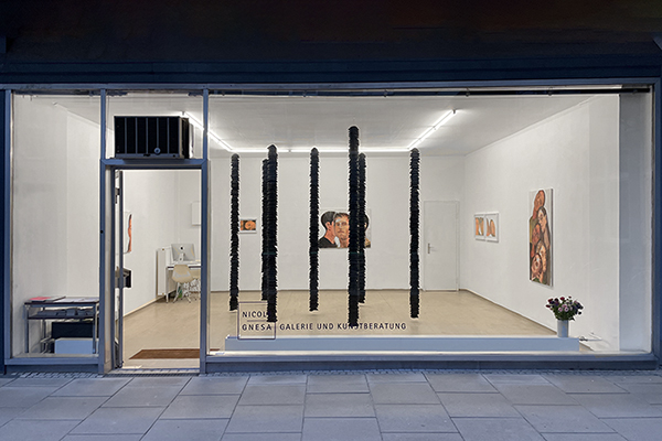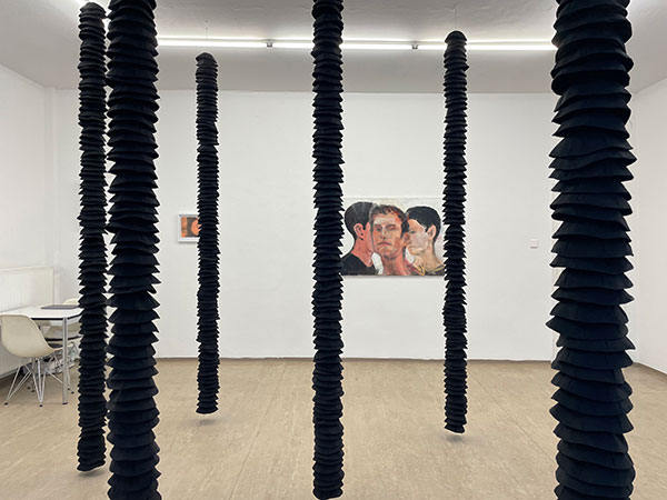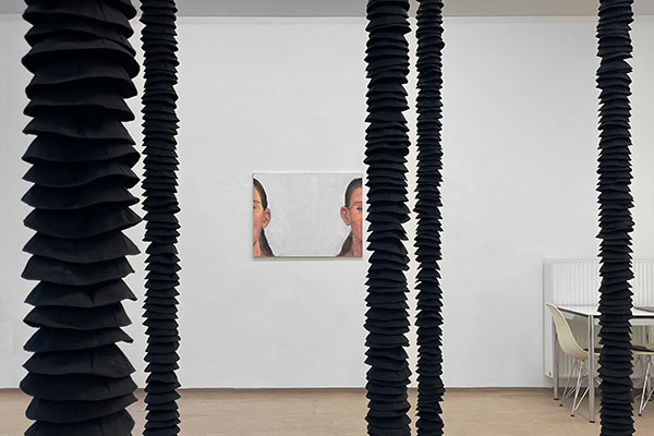 In Floating Columns verwandelt Eran Shakine die Galerie in einen schwerelosen Wald aus aufgehängten Stahlseilen, dicht bestückt mit Hunderten schwarzer Stoffkippot. Diese vertikalen Elemente, wie Säulen ohne ihre tragende Funktion, strukturieren den Raum durch Abwesenheit, Erinnerung und Zerbrechlichkeit, nicht durch Stein und Stahl. Besucher bewegen sich durch einen fragilen, stillen Wald, der auf sie reagiert. Die Kippa, hunderte Male wiederholt, wird zum Material der Erinnerung, in dem das Individuum im Kollektiv aufzugehen scheint.