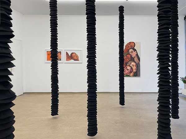 Begleitend zur Installation zeigt Shakine Arbeiten der Werkgruppe The Anatomy Of Emotions, Ölporträts auf Leinwand. In gedämpften, zeitlosen Tönen gemalt, wirken diese Figuren lebendig, gehören jedoch keinem bestimmten Moment oder Modell an. Aus Erinnerung, Vorstellungskraft und gelebter Erfahrung gewonnen, treten sie in einen Dialog mit den schwebenden Kippot über Individualität, Wahrnehmung und Präsenz. Persönliches und Kollektives existieren hier in ständiger Wechselwirkung zwischen Anerkennung und Auslöschung, Nähe und Distanz.