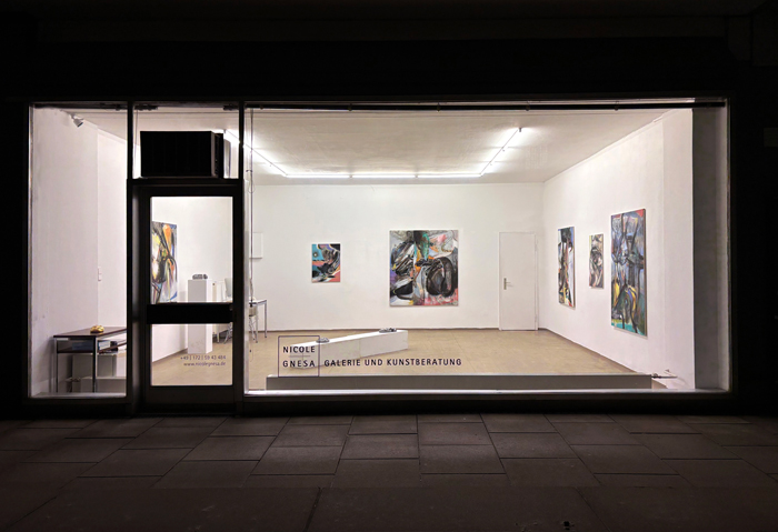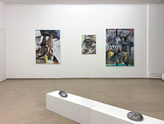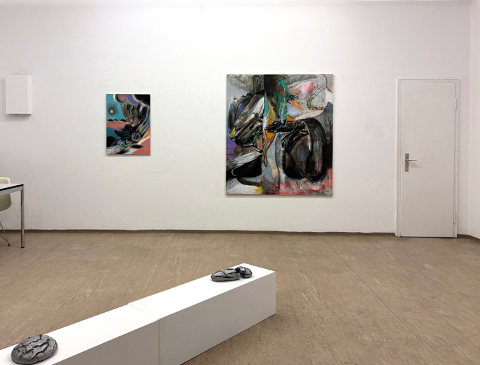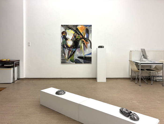 FUZZY CHIMERA Opening reception for the artists: March 12, 2026, 6 pm Exhibition: March 13 - May 2, 2026 Please scroll down for the English version Maurice Merleau-Ponty Formen, Oberflächen und Strukturen ordnen sich scheinbar mühelos ein. Erst im nächsten Moment offenbart sich, dass diese Ordnung brüchig ist. Fuzzy Chimera zeigt neue Arbeiten von Alfredo Barsuglia und Vincent Kern. Ausgangspunkt ist das Gesehene, in dem Vertrautheit und Täuschung zusammenfallen. Alfredo Barsuglias neue Skulpturen wirken aus der Distanz wie amorphe Klumpen. Die Objekte erscheinen metallisch, schwer und fremd, beinahe extraterrestrisch. Bei näherem Hinsehen erweisen sie sich als Brotlaibe. Assoziationen von Einfachheit, Demut und Grundversorgung stellen sich ein. Brot wird als grundlegende Voraussetzung des Lebens lesbar. Die ausgestellten Brotlaibe sind kein Abgüsse in Aluminium, es sind echte Brote, die getrocknet und lackiert wurden, es sind Unikate. Die Wahrnehmung greift vor und fixiert ein Material, das sich im Sehen als Projektion erweist. Nicht das Objekt täuscht, sondern das Bild im Kopf. Mit diesem Moment der Enttäuschung löst sich jede Form von Sozialromantik auf. Das Brot ist weder Monument noch Geste der Bescheidenheit, sondern verfremdet, seiner Funktion als Nahrung enthoben und der Logik des Konsums entzogen. Als Objekt verschiebt sich seine Bedeutung vom Gebrauch zur Zuschreibung. Sichtbar wird nicht der Abguss eines Multiples, sondern eine Erscheinung, die im Vollzug der Wahrnehmung entsteht. Und erst am Ende wird das Material konkret: Handgeknetetes Roggenbrot, ein Stoff mit langer kultureller Geschichte, der in Barsuglias Arbeiten semantisch wie ontologisch radikal verschoben wird. Vincent Kerns neue Arbeiten entfalten einen malerischen Bildraum aus leuchtenden, pastelligen Farben und tiefschwarzen Schlieren. Die Tusche bildet kraftvolle Strukturen, die sich wie Bahnen oder Systeme über die Bildfläche legen. Figürlichkeit scheint auf und entzieht sich zugleich. Körper erscheinen fragmentarisch, Formen bleiben ohne eindeutige Zuordnung. Die Bilder bewegen sich zwischen Zartheit und Kraft. Poetisch helle Farbflächen stehen neben energischen, beinahe technoiden Setzungen. Die Strukturen erinnern an Maschinen, Rohre oder technische Umläufe, zugleich aber auch an digitale Bildlogiken und visuelle Spuren künstlicher Intelligenz. Malerei wird hier zum Ort einer Schwebe zwischen Menschlichem und Technischem, zwischen Geste und System. Technik erscheint nicht als Motiv, sondern als ordnendes Prinzip des Bildes. Die Arbeiten folgen keiner stabilen Logik und kommen nicht zur Ruhe. Überlagerungen, Übermalungen und Korrekturen bleiben sichtbar. Abstraktion ist angestrebt, wird jedoch nie vollständig eingelöst. Das Figürliche kehrt als Rest zurück und hält den Bildraum offen. Verfahren und Bildidee bleiben sichtbar verschränkt. In dieser kontrollierten Anlage öffnet sich ein Raum für das Metaphysische. Kerns Bilder suchen nicht nach Darstellung, sondern nach Annäherung an das, was sich vollständiger Lesbarkeit entzieht. Das Kosmische fungiert dabei weniger als Motiv denn als Konstrukt für Distanz, Unendlichkeit und das Unverfügbare. In beiden Positionen öffnet sich also ein Bezug zum Weltraum. Wärend bei Kern wird dieser explizit wird, etwa in Titeln wie Jupiterbahn, die auf Umlauf, Distanz und Ordnungssysteme verweisen, ohne sie festzuschreiben, bleibt bei Barsuglia das Kosmische implizit. Die Skulpturen wirken auch aufgrund ihrer metallischen Oberfläche fremd, als kämen sie aus einem anderen Zusammenhang, losgelöst von Herkunft und Funktion. Der Weltraum erscheint hier nicht als Ort, sondern als Denkfigur für Entzug, Maßstabslosigkeit und eine Wahrnehmung jenseits des Alltäglichen. In den Arbeiten beider Künstler wird Wahrnehmung nicht als Mittel verstanden, um die Welt abzubilden, sondern als Ort, an dem sie überhaupt erst erscheint. Das Sichtbare verweist dabei immer auf etwas, dessen Bedeutung sich entzieht. Wahrnehmung selbst wird zum Gegenstand, nicht um Gewissheit zu erzeugen, sondern um jene Dimension sichtbar zu machen, in der das Erscheinende mehr ist als das, was gezeigt wird. Die Chimäre bleibt unscharf, nicht aus Mangel, sondern als Haltung. ![]() Forms, surfaces and structures seem to settle effortlessly into place. Only in the next moment does it become apparent that this order is fragile. Fuzzy Chimera presents new works by Alfredo Barsuglia and Vincent Kern. The point of departure is the seen, where familiarity and deception converge. Alfredo Barsuglia's new sculptures appear from a distance like shapeless lumps. The objects seem metallic, heavy and alien, almost extraterrestrial. On closer inspection, the forms reveal themselves to be loaves of bread. Associations of simplicity, humility and basic sustenance arise. Bread becomes legible as a fundamental precondition of life. The loaves on display are not casts in aluminum; they are real breads, dried and lacquered, unique pieces. Perception anticipates and fixes upon a material that proves, in the act of seeing, to be projection. It is not the object that deceives, but the image in the mind. With this moment of disillusionment, any trace of social romanticism dissolves. The bread is neither monument nor gesture of modesty, but estranged, removed from its function as food and withdrawn from the logic of consumption. As an object, its meaning shifts from use to attribution. What becomes visible is not the cast of a multiple, but an apparition that emerges in the act of perception. Only at the end does the material become concrete: hand-kneaded rye bread, a substance with a long cultural history that, in Barsuglia's work, is radically displaced both semantically and ontologically. Vincent Kern's new works unfold a painterly pictorial space of luminous pastel colors and deep black streaks. The ink forms powerful structures that spread across the surface like trajectories or systems. Figuration 